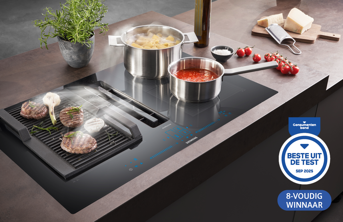 Geniet van meer ademruimte in je keuken met de inductionAir Plus van Siemens: de compacte combinatie van een intuïtieve inductiekookplaat en een efficiënt afzuigingsysteem. Niet alleen beschik je met dit twee-in-één-apparaat over meer opbergruimte en een vrijer zicht, je geniet ook van meer frisse lucht, want de kookluchten worden direct bij de bron afgevoerd. Bekijk het Siemens assortiment online of kom ze bewonderen bij Inspiratiehuis 20|20. In onze showroom kun je ook het type EX807NX68E bekijken en uitproberen. Deze kookplaat met afzuiging is door de Consumentenbond als Beste getest.